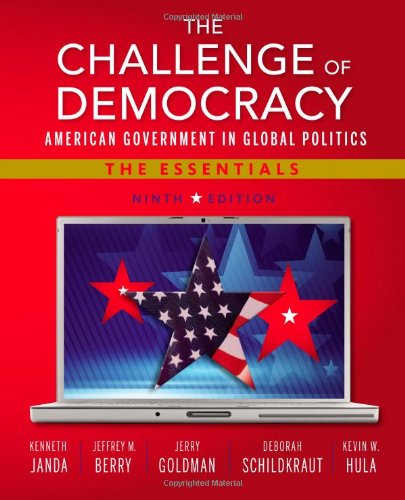 THE CHALLENGE OF DEMOCRACY: AMERICAN GOVERNMENT IN GLOBAL POLITICS, THE ESSENTIALS introduces new co-author Debra Schildkraut to this stellar author team. This best-selling American government text is highly acclaimed for the non-ideological framework it uses to explore three themes: freedom, order, and equality as political values; the majoritarianism versus pluralism debate; and globalization's effect on American politics. Using an easy to follow approach, with chapters and subheadings numbered and organized by learning outcomes, and a new end of chapter "Assessing Your Understanding" section where students can can test their knowledge, the ninth edition provides a solution for teaching and assessing course learning outcomes. Extensively updated, this condensed edition includes new examples, figures, data, and current discussions. The authors include balanced coverage of Obama's historical presidency and coverage and analysis of the 2012 presidential primary campaign and election. This ninth edition of THE CHALLENGE OF DEMOCRACY, THE ESSENTIALS is an abridged version of the twelfth edition of THE CHALLENGE OF DEMOCRACY. See "Features" for details.From reader reviews: